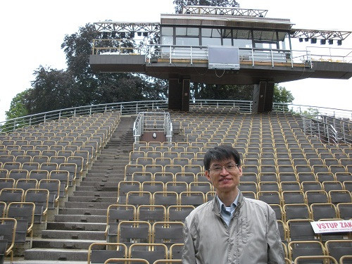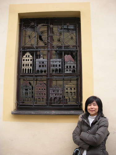 這是在玫瑰飯店前的小公園拍的,後面是彩繪塔,許多明信片都是從這角度取景,晚餐的啤酒後當然又是臉紅紅了