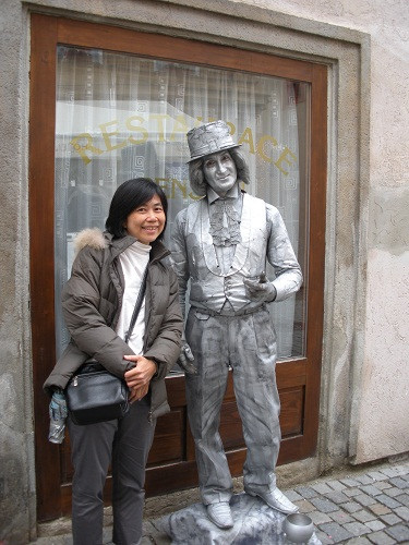 這位街頭藝人一直對太太拋媚眼,表情也很可愛,我們離開了還一直行禮、送飛吻